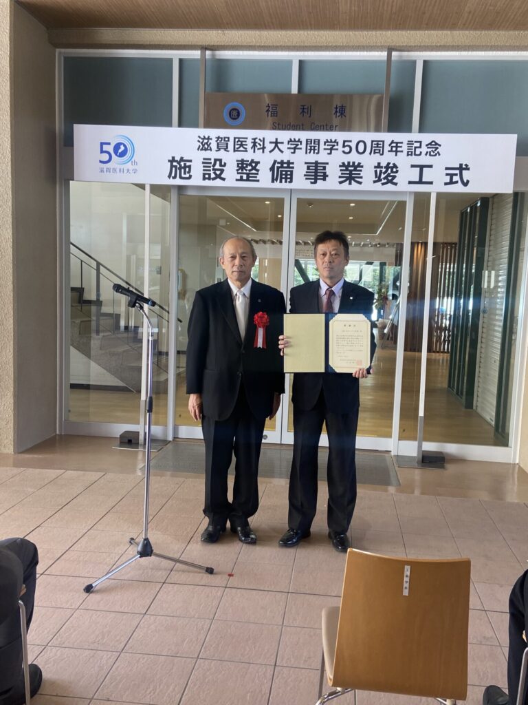 感謝状を受領しました。滋賀医科大学開学50周年記念施設整備事業竣工式