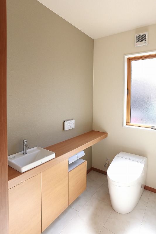 家族が毎日使うトイレだから広くをこだわりに落ち着いた感じに仕上げ
