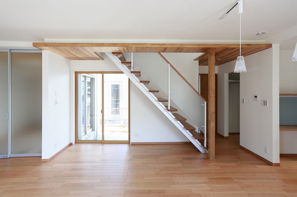 解放感をだすために設置したスケルトン階段、一部天井を板張りしてよりおしゃれに!リビング階段にすることで廊下が減り別の場所での収納計画をしています。